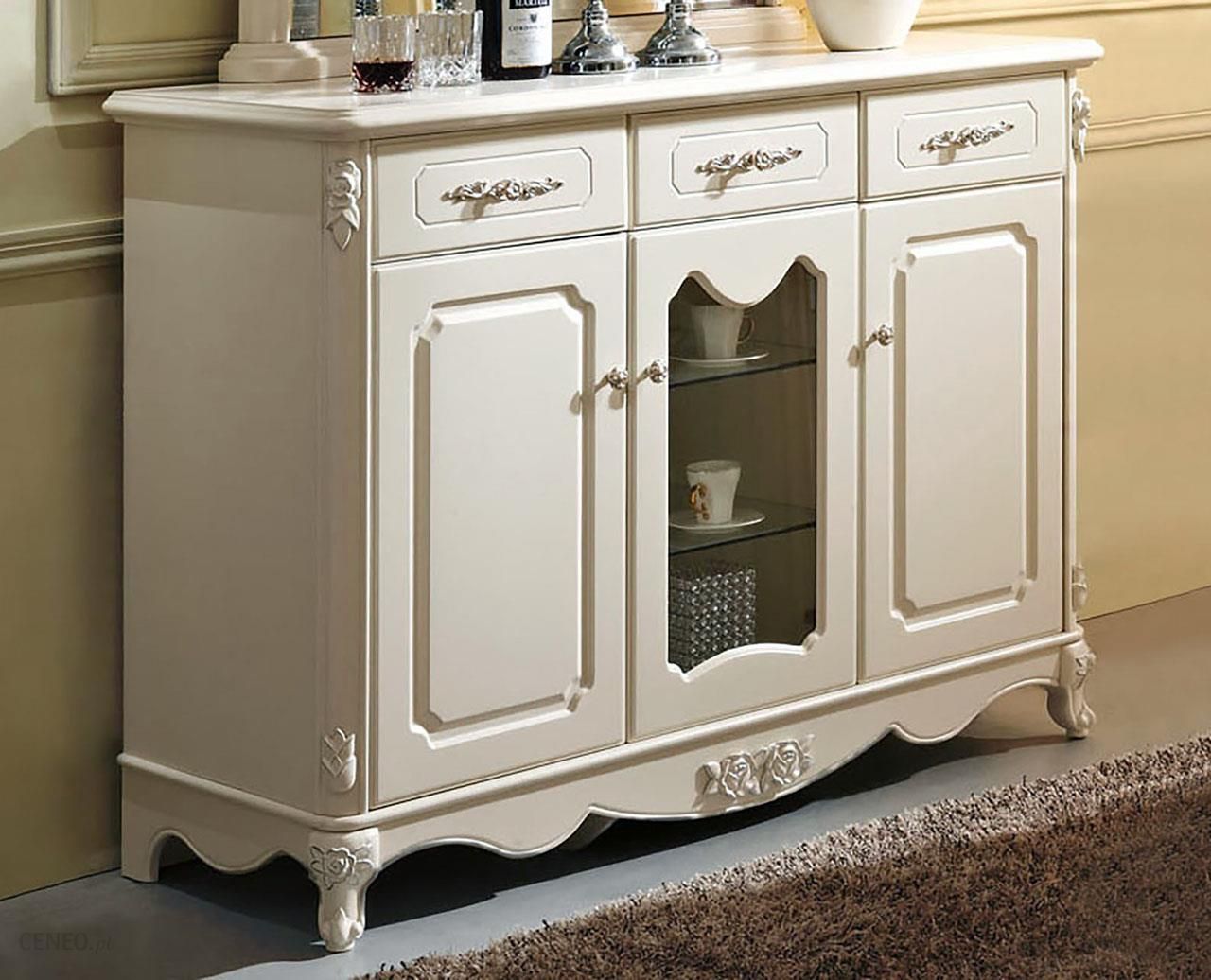 Stylowa komoda Arietta. Wymiary: 136 x 50 x 100 cm. 3-drzwiowa komoda do salonu. Środkowe drzwi przeszklone, pozostałe zabudowane. Wyposażona w 3 szufladki. Frezowane fronty, sztukateria, ozdobne gałki i uchwyty. Materiał: płyta MDF w kolorze ecru. Kolekcja mebli La Perle.