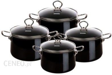 Specyfikacja:Kolor: czarnyMateriał: StalPowłoka: powłoka emaliowanaMarka: Silesia RybnikZastosowanie: Zmywarka, Kuchenka indukcyjna, Kuchenka ceramiczna, Kuchenka elektryczna, Kuchenka gazowaZestaw garnków „Izydor” zawiera :1 x garnek z pokrywą 16 cm, wysokość – 11,3 cm, pojemność – 2,1 l1 x garnek z pokrywą 18 cm, wysokość – 12,2 cm, pojemność – 3,1 l1 x garnek z pokrywą 20 cm, wysokość – 13,1 cm, pojemność – 4,1 l1 x garnek z pokrywą 22 cm, wysokość – 14,6 cm, pojemność – 5,5 l