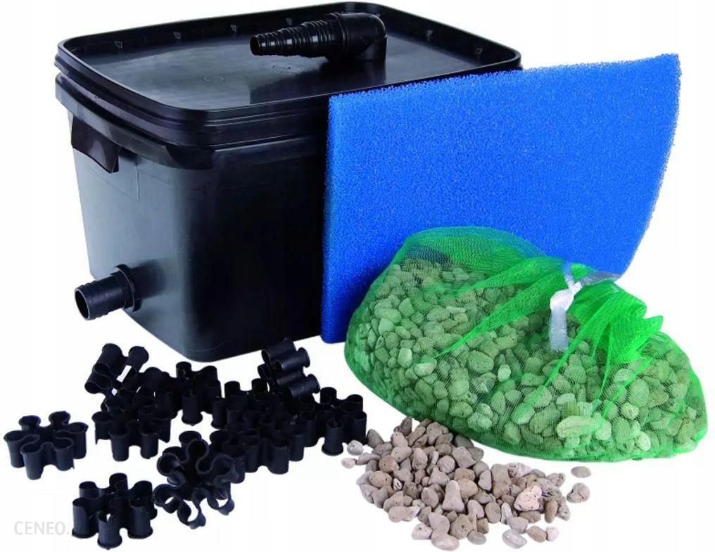 Zestaw filtrujący FiltraPure 2000 posiada pojedynczą komorę z różnorodnymi materiałami do filtrowania wody stawu. Filtruje wodę w biologiczny–mechaniczny sposób poprzez różne materiały. Dzięki średniemu filtrowi i gąbce filtrującej zestaw zapewnia szybkie i efektywne czyszczenie. Ten prosty, ale skuteczny filtr można przygotować i zainstalować w mgnieniu oka przy stawie. Jego objętość to 16 L i może być użyty do stawów o objętości nieprzekraczającej 1000 L (z rybami) lub 2000 L (bez ryb). Prosimy mieć na uwadze że pompa i lampa UVC nie są częścią dostawy.