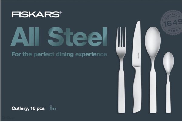 Fiskars Komplet sztućców All Steel 16 szt Sztućce kuchenne wykonane są z wysokiej jakości stali nierdzewnej w fabryce Sorsakoski w Finlandii. Zestaw składa się z widelców, noży, łyżek i łyżeczek w nowoczesnym tonie. Przeznaczony jest dla czterech osób. Dzięki niemu nakryty stół w Twoim domu będzie zawsze prezentował się stylowo. Zestaw 16-częściowego kompletu sztućców Fiskars All Steel: 4x widelec 4x nóż 4x łyżka 4x łyżeczka Parametry techniczne 16-częściowego kompletu sztućców Fiskars All Steel: liczba sztuk w zestawie: 16 materiał: stal nierdzewna waga: 1 kg wymiary opakowania: 25 x 16,9 x 5,5 cm