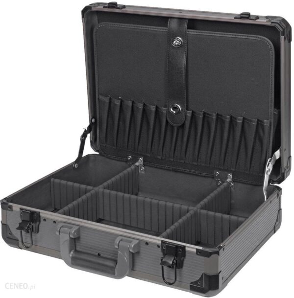 Profesjonalna walizka aluminiowa, którą możesz dostosować do swoich potrzeb dzięki wyjmowanym separatorom i przegródkom. W wyściełanym wnętrzu znajduje się również rozkładana przegródka na narzędzia oraz stała przegródka na dokumenty. Stronę zewnętrzną zdobi uchwyt do przenoszenia i zatrzaskowe zamknięcie.