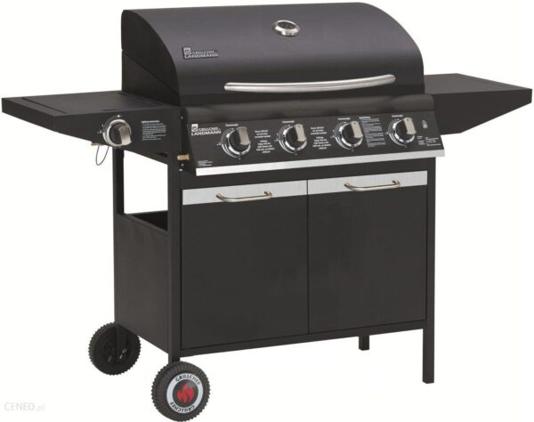 Grill gazowy Landmannwykonanie z kombinacji lakierowanej i emaliowanej blachy stalowejemaliowany dwuczęściowy ruszt do grillowaniaruszt do podgrzewania potraw4 niezależne palniki ze stali szlachetnejpalnik boczny do gotowaniamisa tłuszczowawskaźnik temperatury w pokrywiepółki boczne (x2)zamykana szafka dolnauchwyt ze stali szlachetnejzintegrowany w pokrętle piezozapalaczdołączony wąż i reduktor ciśnieniowyruszt żeliwny o powierzchni grillowania 65 x 40 cmodpowiedni dla ok. 12 osób