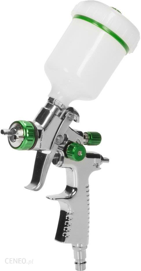 Naprawde profesjonalny pistolet typu LVMP. Do nanoszenia lakieru na obrabiany przedmiot stosowana jest mala objetosc powietrza o srednim cisnieniu. Technologia zmniejsza zuzycie lakieru. redukuje ilosc mgly lakierniczej. skraca czas schniecia i umozliwia stosowanie mniejszych kompresorów. Mozna regulowac zarówno obraz rozpylania. jak i ilosc lakieru. a lakier jest pobierany z zamontowanego na górze zbiornika. Obudowe wykonano z odlewu aluminium. Zarówno dysza. jak i igla sa wykonane ze stali nie